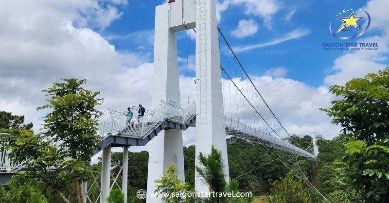 Xung quanh cây cầu là những rừng thông bạt ngàn, tán lá reo vui trong gió, mang đến không khí trong lành và mát mẻ. Xa xa, tiếng thác nước chảy róc rách, hòa cùng tiếng chim hót líu lo, khiến không gian càng trở nên yên bình và thư thái.