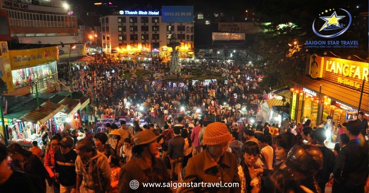 Đến Đà Lạt về đêm, du khách không thể bỏ qua chợ đêm Đà Lạt – điểm đến sầm uất bậc nhất thành phố. Nằm ngay trung tâm Đà Lạt, trên đường Nguyễn Thị Minh Khai, Phường 1, nơi đây còn được biết đến với tên gọi chợ Âm Phủ. Với không gian nhộn nhịp, hàng trăm gian hàng bày bán ẩm thực đêm hấp dẫn như bánh tráng nướng, khoai lang nướng, sữa đậu nành nóng, cùng vô số lựa chọn mua sắm từ đồ len, quà lưu niệm đến đặc sản Đà Lạt như trà atiso, mứt hoa quả. Giá cả chợ khá bình dân, mang đến cho du khách trải nghiệm trọn vẹn không khí Đà Lạt về đêm. Hãy tìm hiểu cùng Saigon Star Travel nhé!