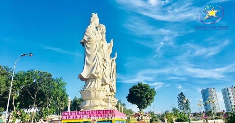 Đặc biệt, chùa sở hữu nhiều pho tượng quy mô lớn, như tượng Phật Thích Ca Mâu Ni nhập Niết Bàn trên tòa sen, tượng Quan Thế Âm Bồ tát cao 17m đứng trên đầu rồng. Trước chính điện rộng hơn 4.000m² là tượng Phật Di Lặc bằng đá hoa cương nguyên khối, cao 5,1m, nặng 40 tấn, xác lập kỷ lục “Chùa có pho tượng Phật Di Lặc nguyên khối lớn nhất Việt Nam.”