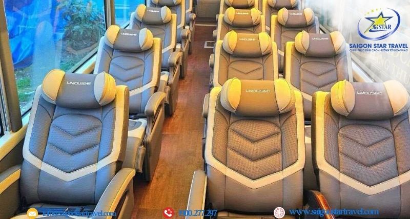 Xe Limousine tại Saigon Star Travel được trang bị ghế VIP chỉnh điện, massage, màn hình LCD, wifi tốc độ cao, ổ cắm sạc, tủ lạnh mini, đèn LED, rèm cửa cao cấp. Với Limousine giường nằm, mỗi giường còn có khoang riêng, rèm che, bàn gập mini và hệ thống điều chỉnh cá nhân.