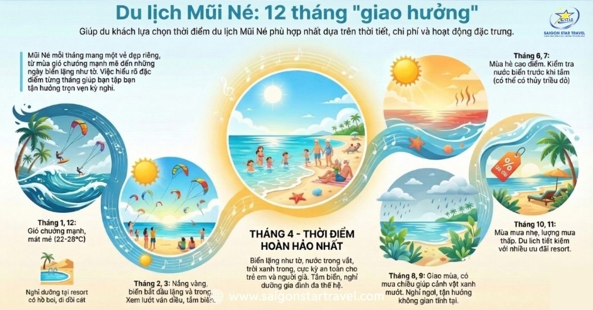 Saigon Star Travel sẽ khơi mở bức tranh thời tiết chi tiết theo từng tháng, giúp bạn tìm thấy "thời điểm vàng" phù hợp nhất với gu xê dịch của mình và giải đáp trọn vẹn câu hỏi nên đi Mũi Né mùa nào đẹp dưới bài viết này