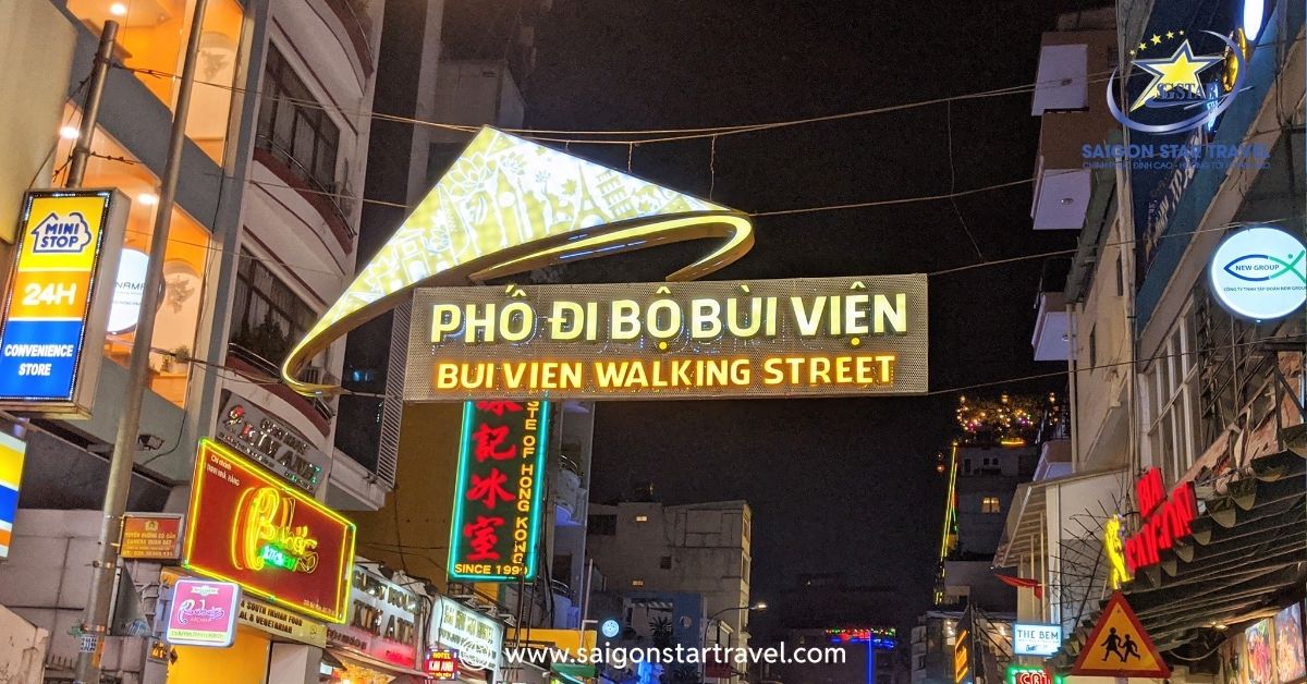 Nằm ngay giữa Quận 1, TP.HCM, phố đi bộ Bùi Viện dài khoảng 850m là một trong những điểm đến không thể bỏ qua khi khám phá cuộc sống về đêm tại Sài Gòn. Với vị trí đắc địa trên đường Bùi Viện, phường Phạm Ngũ Lão, con phố này được ví như phố Tây Sài Gòn, thu hút hàng ngàn du khách nước ngoài và giới trẻ mỗi dịp cuối tuần. Khi đồng hồ điểm 19h, cả khu phố bừng sáng với ánh đèn neon rực rỡ, âm nhạc đường phố sôi động, biểu diễn nghệ thuật hấp dẫn và những quán bar – pub náo nhiệt kéo dài đến tận 2h sáng. Bạn có thể thỏa sức thưởng thức ẩm thực đường phố, nhâm nhi cocktail mát lạnh, hay đơn giản là tản bộ giữa không gian náo nhiệt, mang đậm chất “đa văn hóa” độc đáo mà chỉ Bùi Viện mới có. Hãy cùng Saigon Star Travel tìm hiểu về địa điểm du lịch này nhé!
