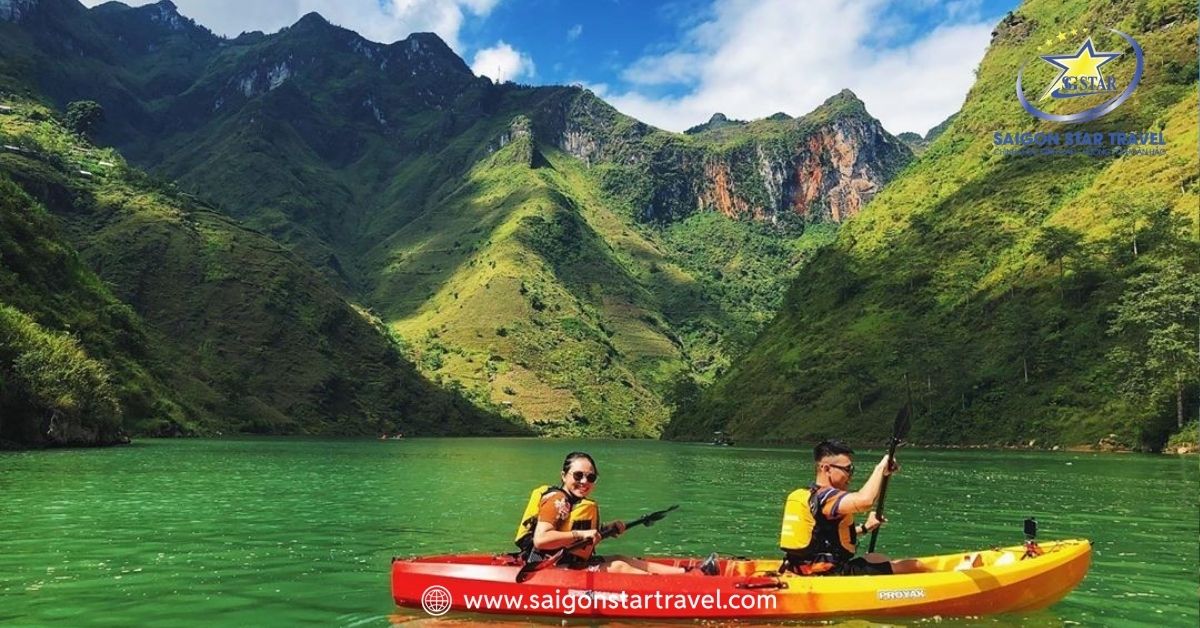 Đến với Sông Nho Quế, trải nghiệm du thuyền hoặc kayak là hoạt động được yêu thích nhất. Ngồi trên thuyền, du khách có thể thong thả ngắm nhìn hẻm Tu Sản, hít thở không khí trong lành và ghi lại những khoảnh khắc đáng nhớ. Đối với những ai ưa mạo hiểm, việc tự chèo kayak trên mặt nước xanh ngọc bích sẽ mang lại cảm giác tự do và chinh phục đầy thú vị.