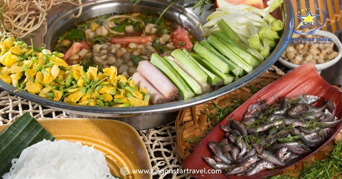 - Canh chua cá linh nấu với bông điên điển, mang hương vị mùa nước nổi miền Tây.