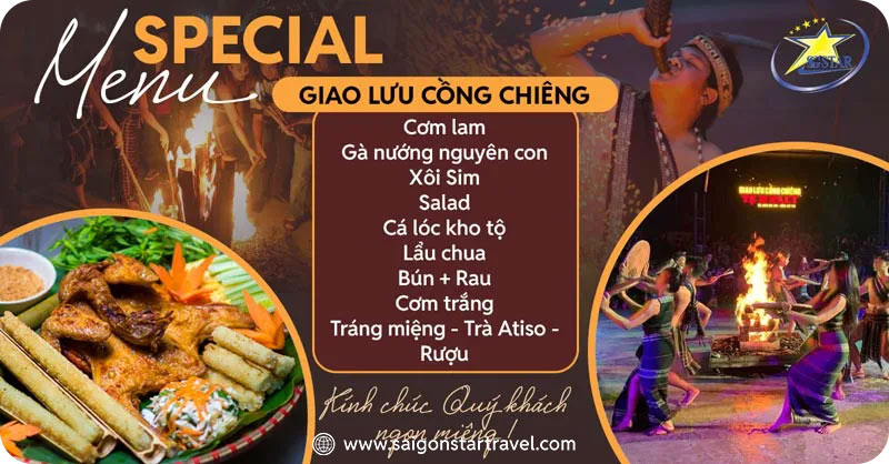 ✔ Ăn chính: 04 bữa tiêu chuẩn 150.000đ/suất, trong đó có 1 bữa buffet rau và 1 bữa gà nướng cơm lam & giao lưu cồng chiêng.