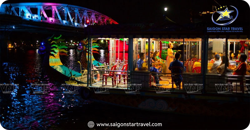 🔵 Ngồi thuyền Rồng nghe Ca Huế và thả hoa đăng cầu may trên dòng Hương Giang hoặc trải nghiệm xe 2 tầng mui trần (Hop-On Hop-Off) dạo quanh ngắm cảnh Cố Đô thơ mộng về đêm (tự túc phí thăm quan).