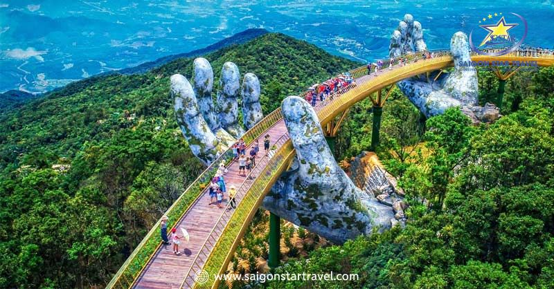 Quý khách sẽ tận hưởng cảm giác bồng bềnh khi ngồi trên Cabin lơ lửng giữa chừng mây. Viếng chùa Linh Ứng với tượng Phật Thích Ca cao 27m, viếng đền thờ Bà Chúa Mẫu Thượng Ngàn. Tham quan Cầu vàng - HOT Cây cầu độc đáo nằm trong vườn Thiên Thai ở Bà Nà Hill - được xây dựng trên độ cao 1.400m so với mặt nước biển, cây cầu gồm 8 nhịp và có độ dài là 150m. Cây cầu được nâng đỡ bởi đôi bàn tay khổng lồ. Người đi như lạc giữa tiên cảnh nơi có mây, trời bao la.