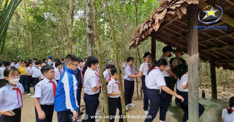 08h40: Đến Địa Đạo Củ Chi, các em sẽ được xem phim tư liệu về quá trình hình thành và các giai đoạn phát triển của địa đạo. Tại đây, các em còn được khám phá các công cụ sinh hoạt và chiến đấu, tìm hiểu về cuộc sống của những người chiến sĩ trong từng thời kỳ.