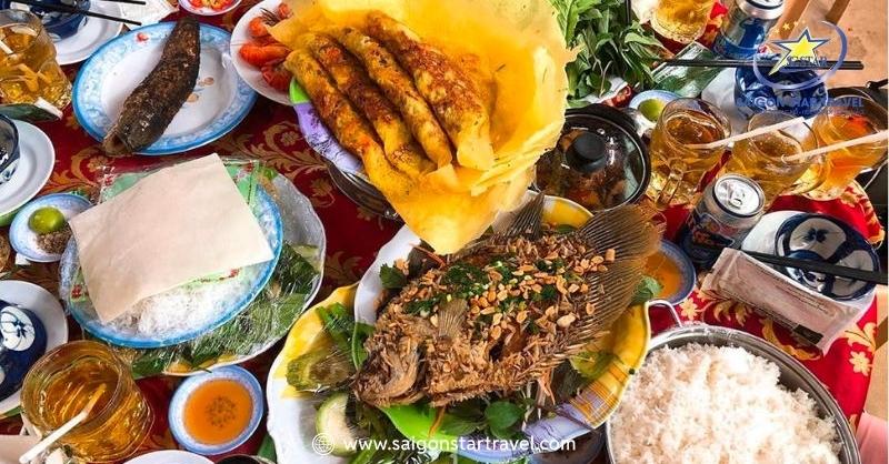 12h00: Dùng bữa trưa với Set Menu Nam Bộ như: Cá tai tượng chiên xù, Gỏi củ hủ dừa tép thịt, Bánh xèo hến tép, Lẩu chua cá hú, Cá lóc kho + rau luộc, Cơm trắng + Tráng miệng + Trà đá.