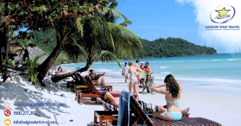 15h00: Thư giãn tại Bãi Sao, bãi biển nổi tiếng nhất Phú Quốc với làn nước xanh trong vắt, cát trắng mịn màng, tự do tắm biển, chụp ảnh, nghỉ ngơi hoặc thưởng thức nước dừa mát lành bên bờ biển.
