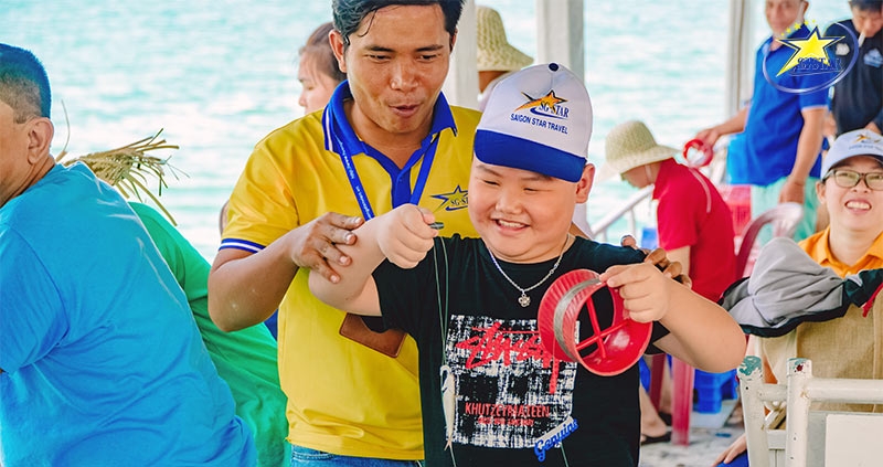 Ngày thứ hai là phần trải nghiệm đặc trưng nhất với chương trình đi biển, câu cá, lặn ngắm san hô và tham quan nhiều bãi đẹp của Nam Du.