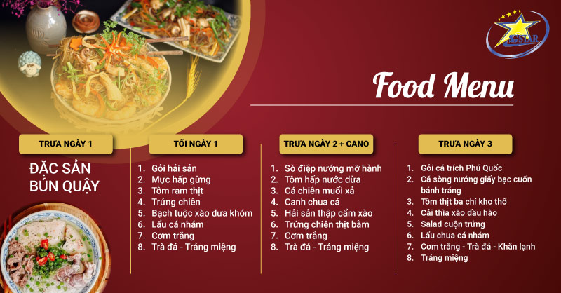 - Ăn sáng: 01 bữa Set menu tô/ly + 2 bữa buffet tự chọn nếu chọn từ 3 sao.