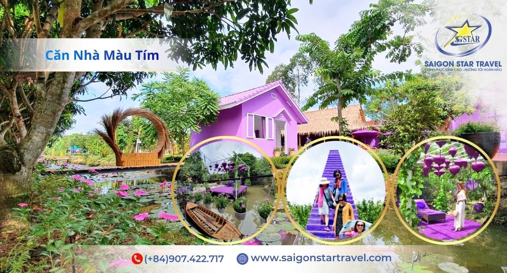 12h30 – 14h00: Đoàn lên xe rời khu du lịch sinh thái, bắt đầu hành trình quay về hướng TPHCM. Trên đường đi, đoàn ghé tham quan Căn nhà màu tím – điểm check-in đang rất được yêu thích bởi không gian được trang trí chủ đạo với gam màu tím lãng mạn, vườn hoa và nhiều góc sống ảo xinh xắn. Anh/chị có thời gian tự do chụp hình, thưởng thức nước uống, thư giãn và lưu lại những bức ảnh kỷ niệm đẹp cho chuyến đi.