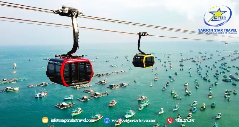 Một trong những trải nghiệm không thể bỏ lỡ khi du lịch Phú Quốc lễ 30/4 chính là ngồi trên cáp treo Hòn Thơm – tuyến cáp treo 3 dây vượt biển dài nhất thế giới. Đây không chỉ là hành trình di chuyển mà còn là cơ hội để tận hưởng cảm giác “bay” giữa trời cao, nơi bạn có thể chiêm ngưỡng toàn cảnh thị trấn An Thới, những hòn đảo xinh đẹp và đại dương xanh thẳm từ trên cao.